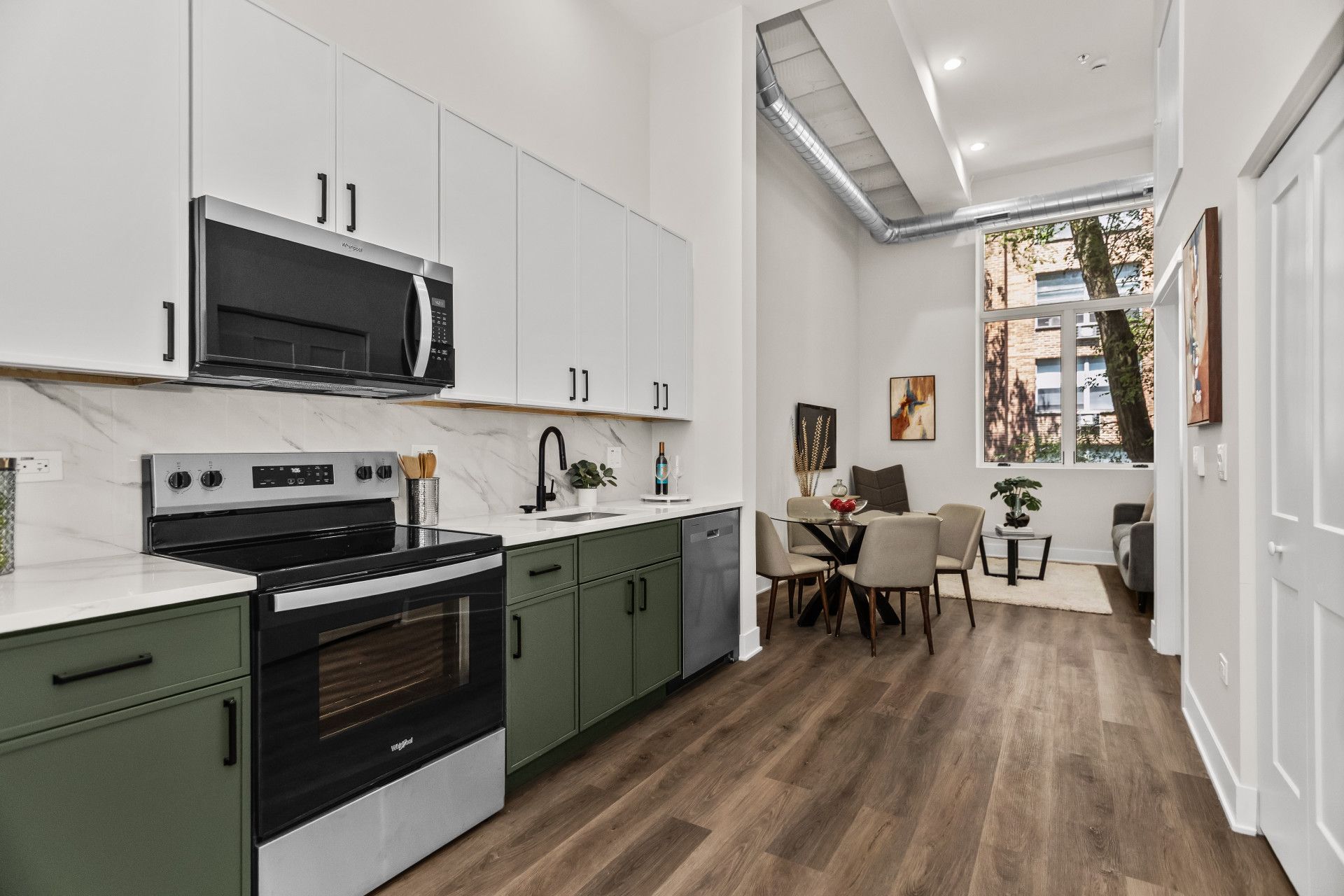 Stainless steel appliances, slim shaker-style cabinetry in bold green and white finishes, quartz counters, matte black fixtures, sleek luxury plank flooring, high ceilings, and massive windows are just some of the features you will find in every apartment! While the majority of finishes will be the same in all apartments, there will be some variation from unit to unit, as some bathrooms will have stand-up showers with frameless shower doors while others will have bathtubs, many are loft-style with 2 levels, some will have kitchen islands, and so forth!
