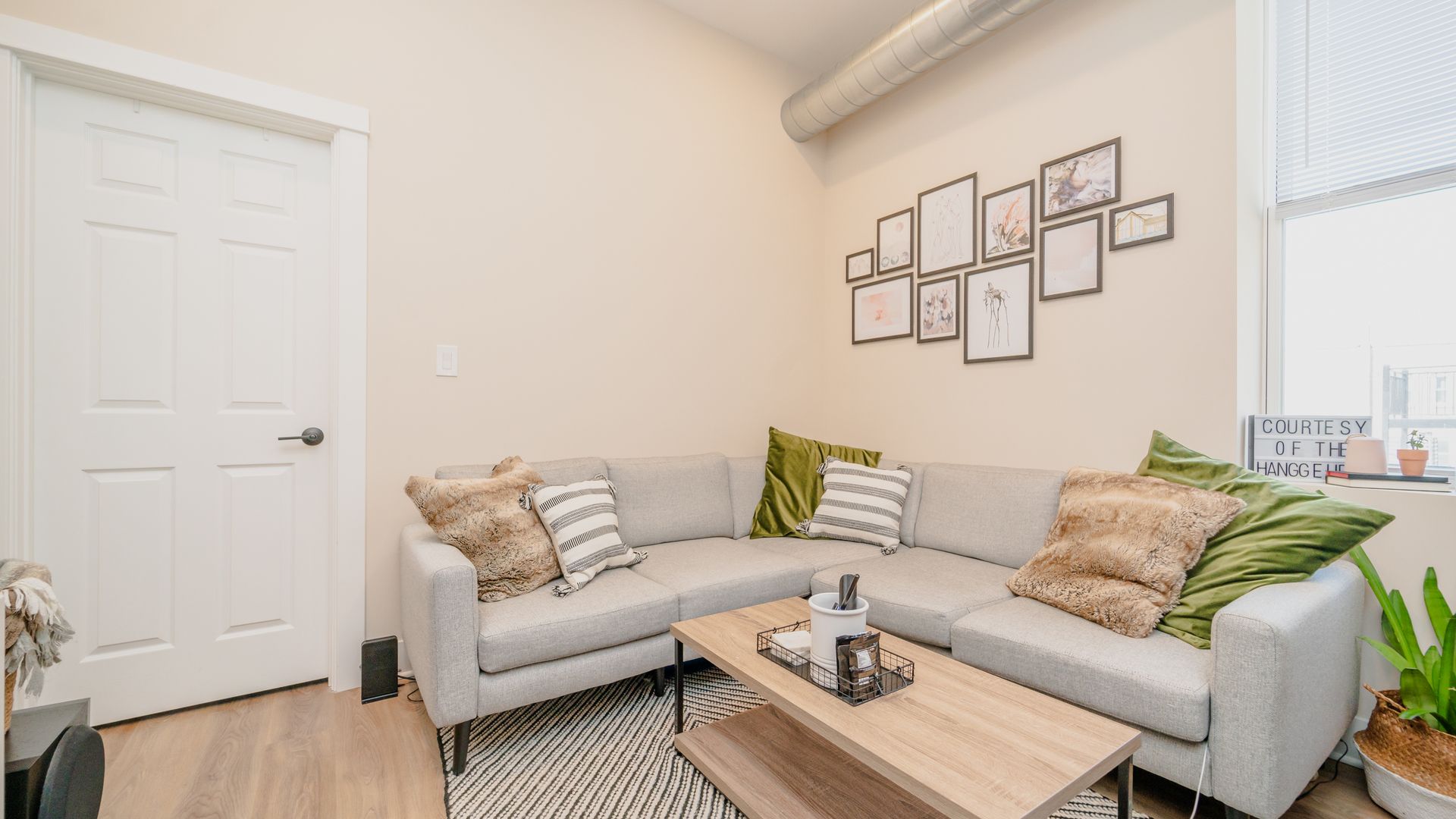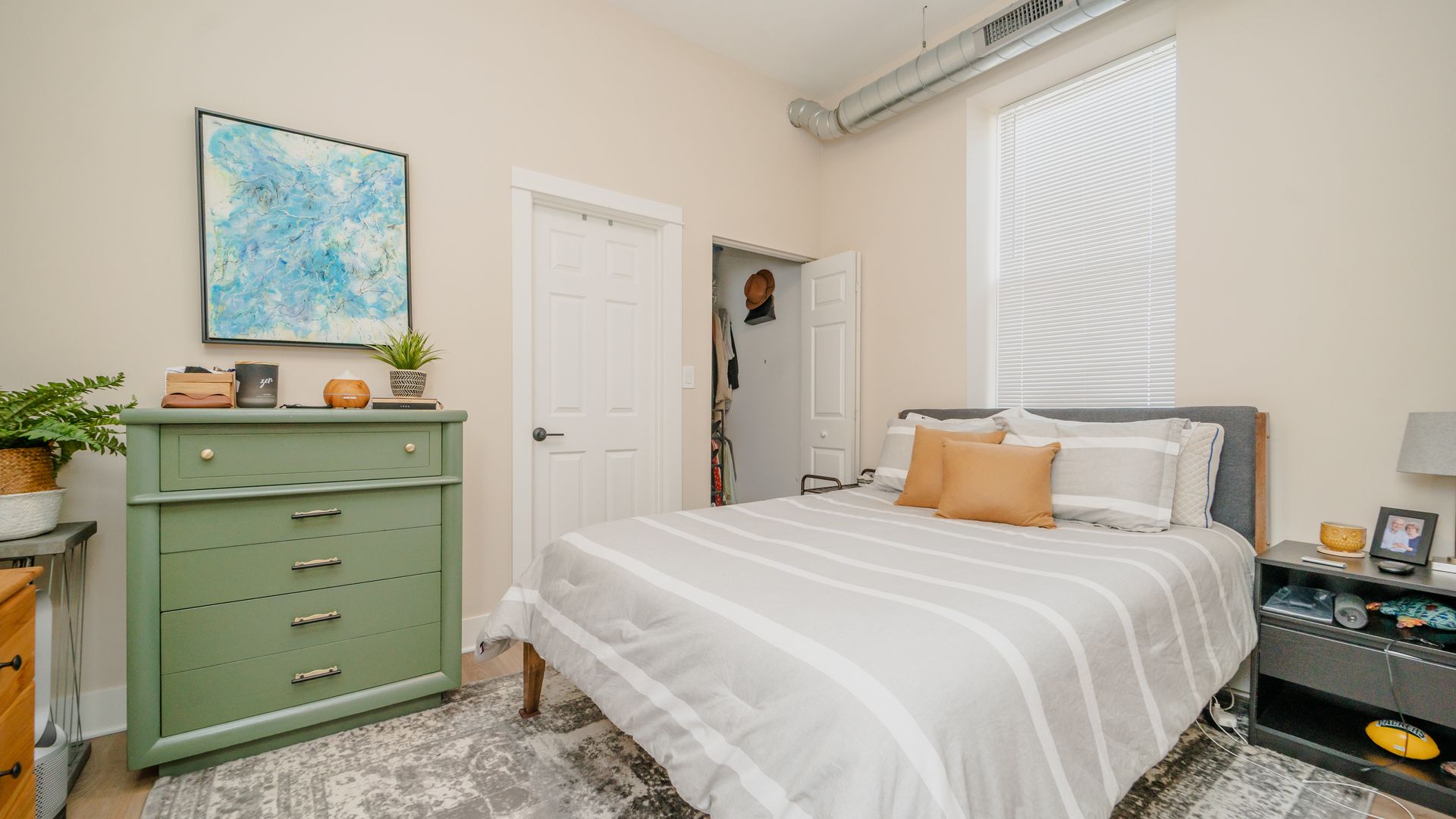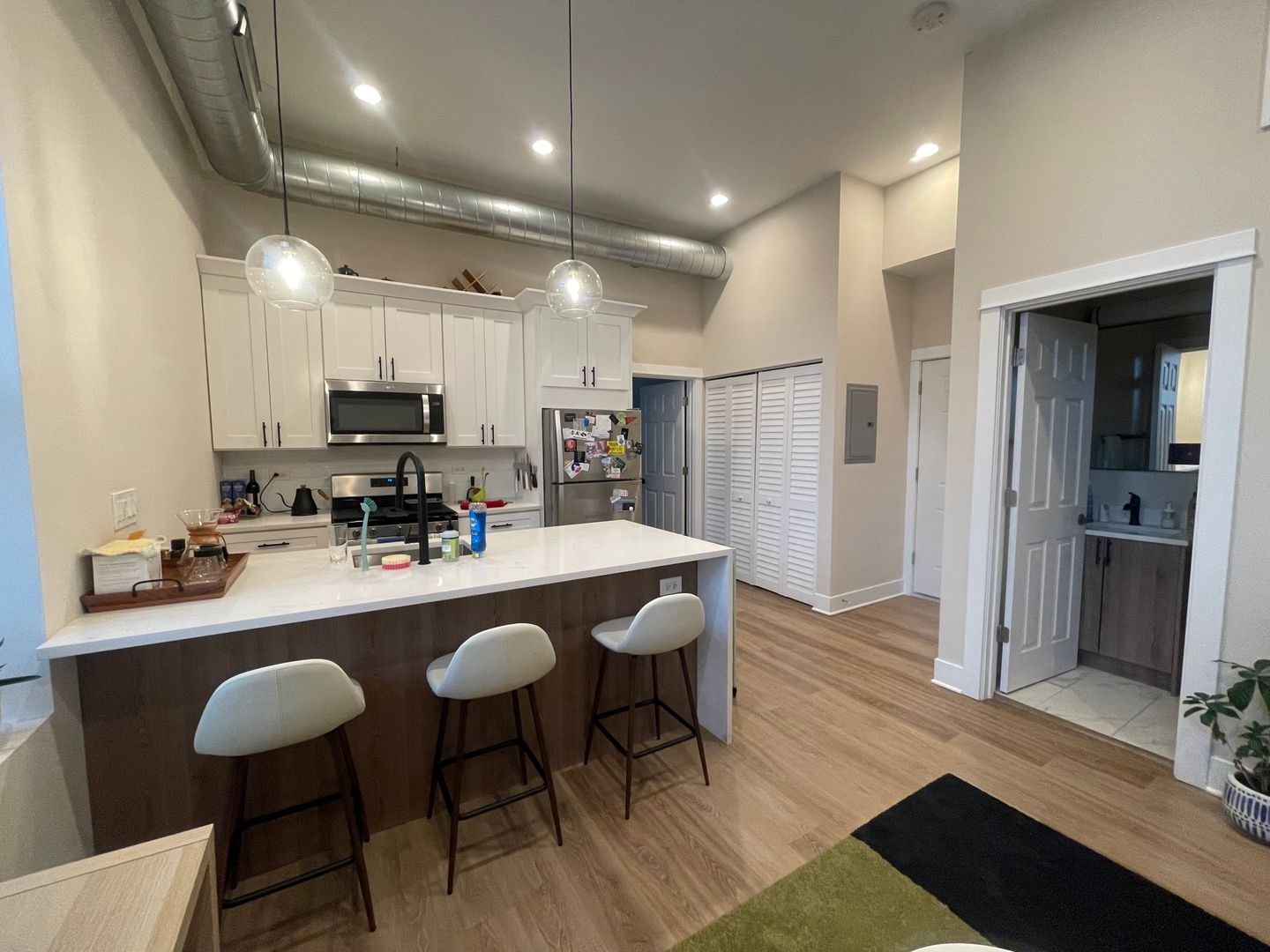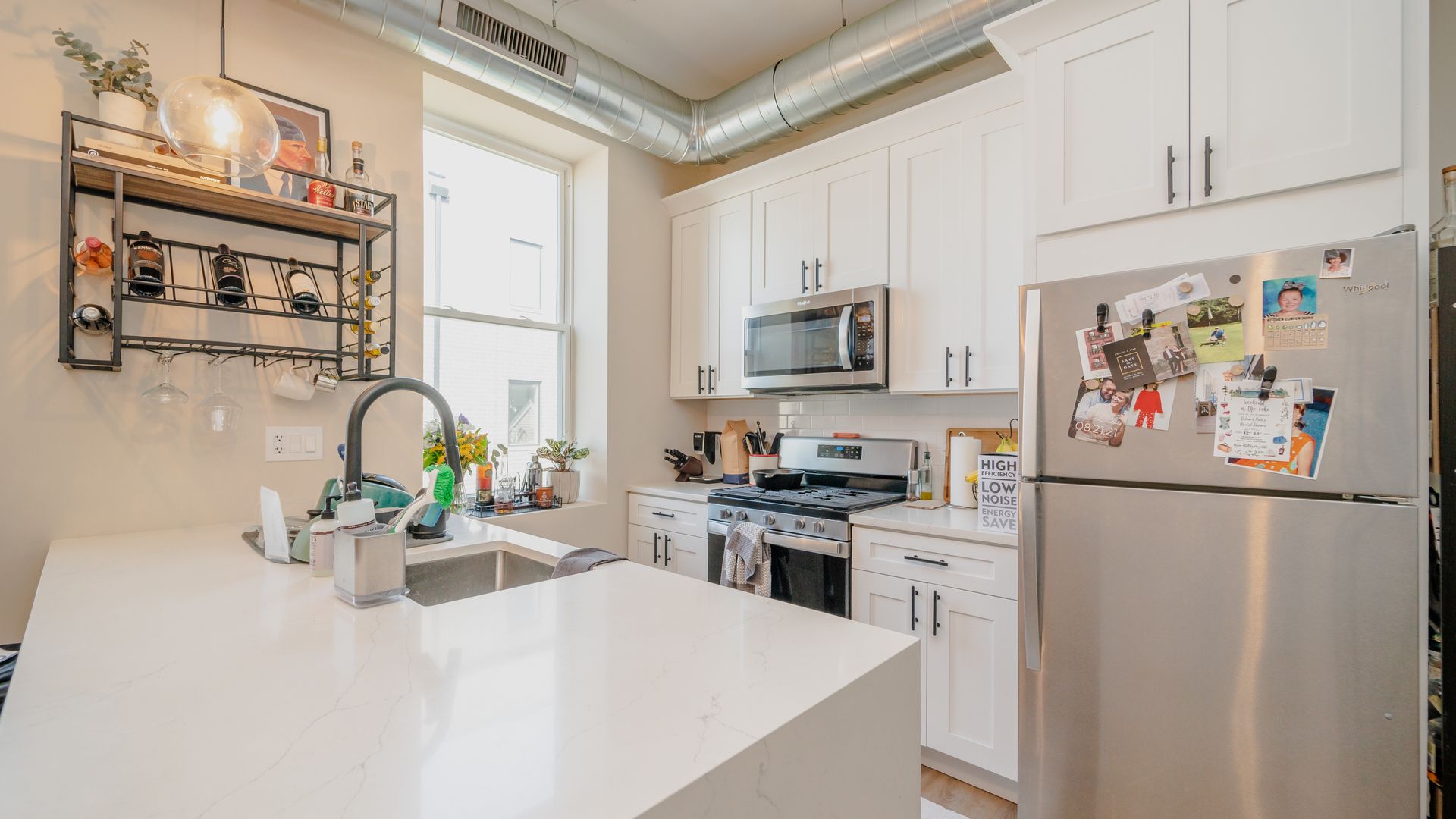 UNIT FEATURES: Stainless steel energy-efficient kitchen appliances, in-unit washer & dryer (full size), central heat & AC, soft-close modern cabinetry with pull out cabinet drawer for garbage/recycling bins & quartz countertops, hardwood flooring, bathroom with glass-enclosed shower, durable porcelain tile and quartz vanity tops with a vessel sink.