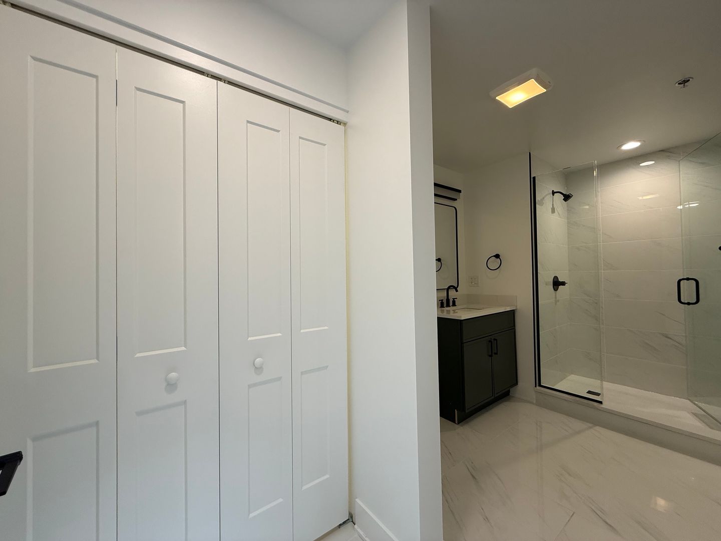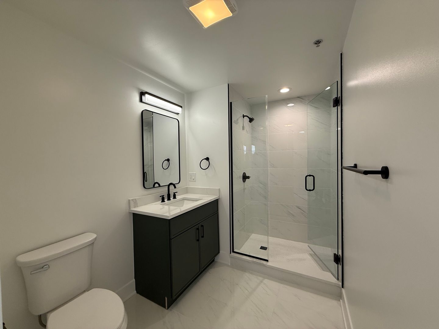 • Frameless Glass-Enclosed Stand-Up Shower in Bathroom