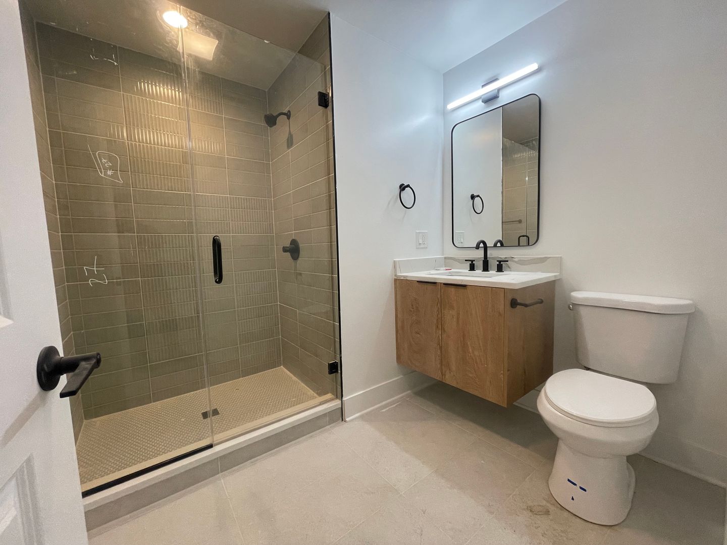 • Frameless Glass-Enclosed Stand-Up Shower in Bathroom