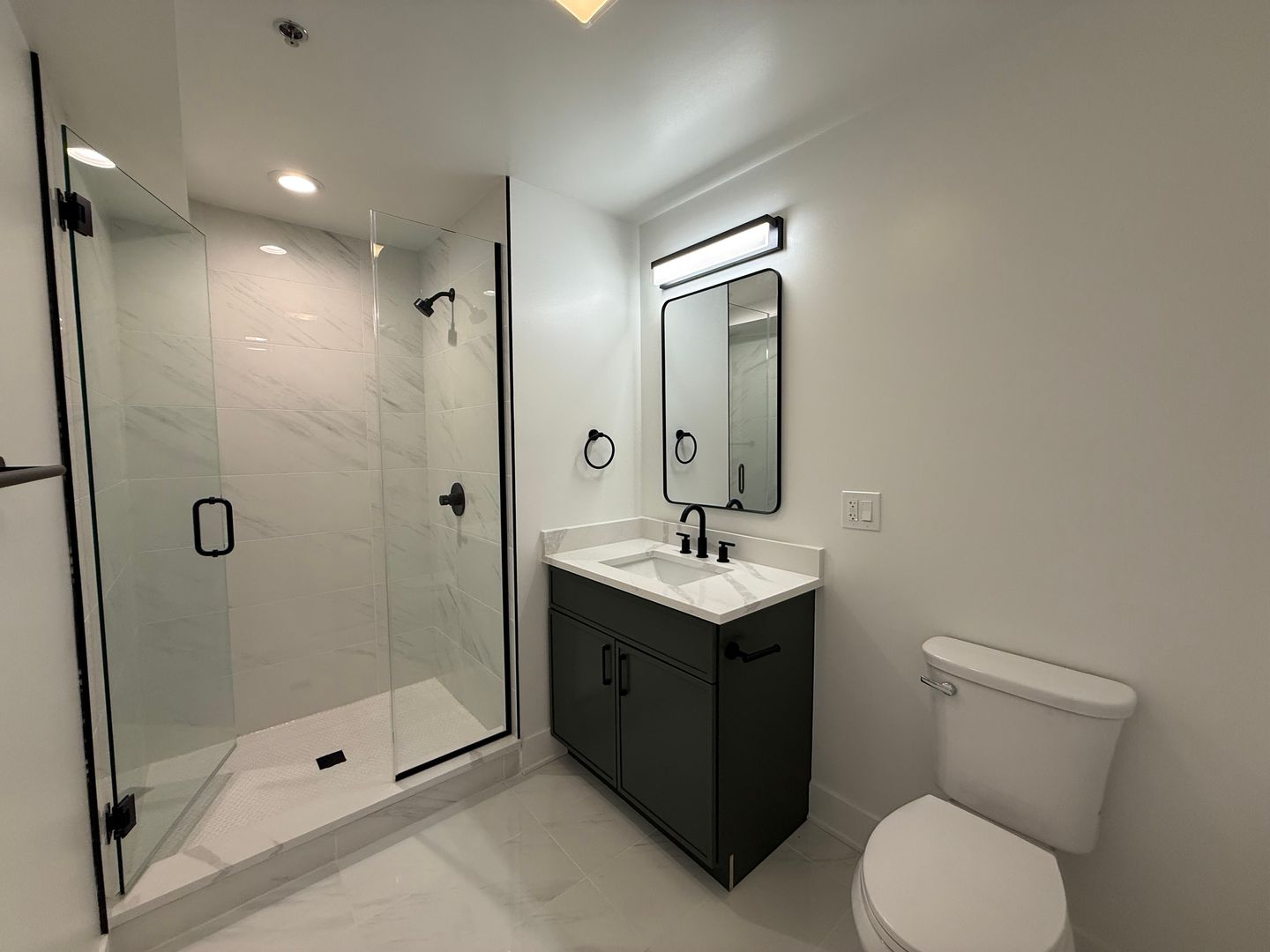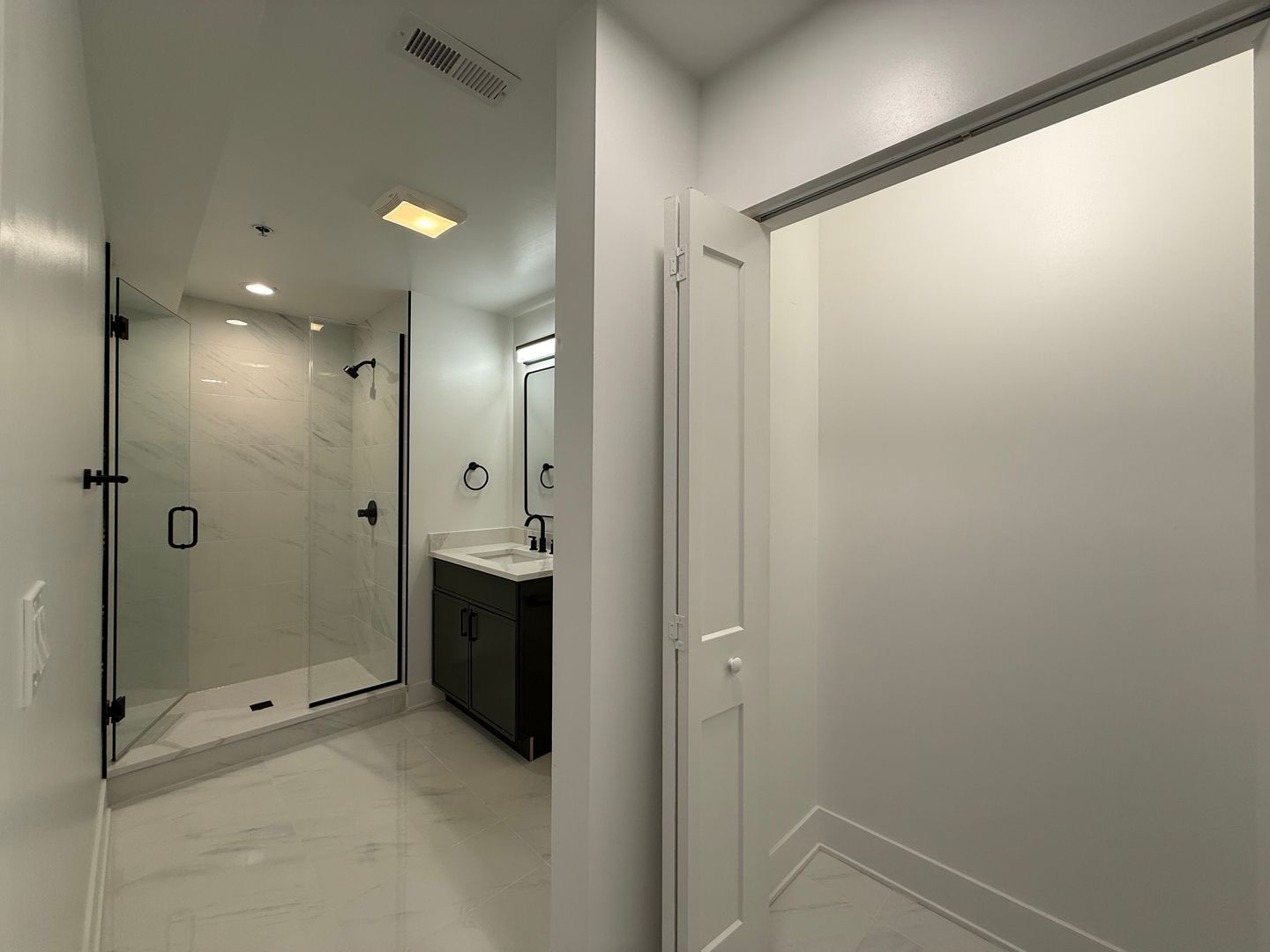 • Frameless Glass-Enclosed Stand-Up Shower in Bathroom