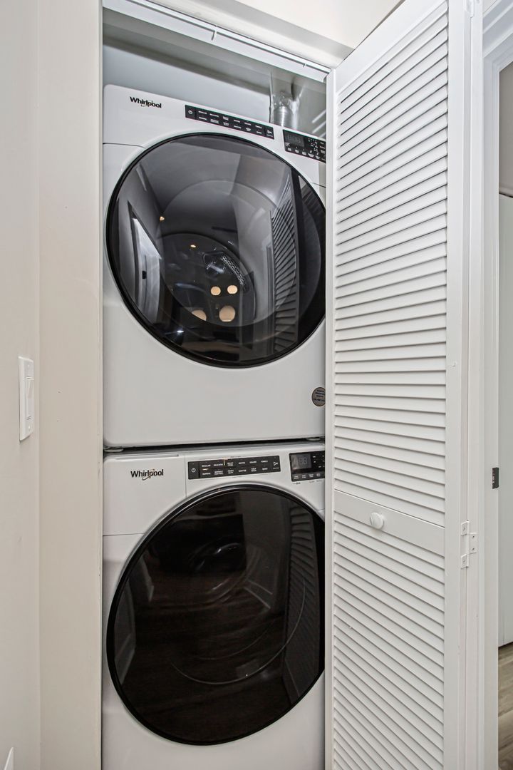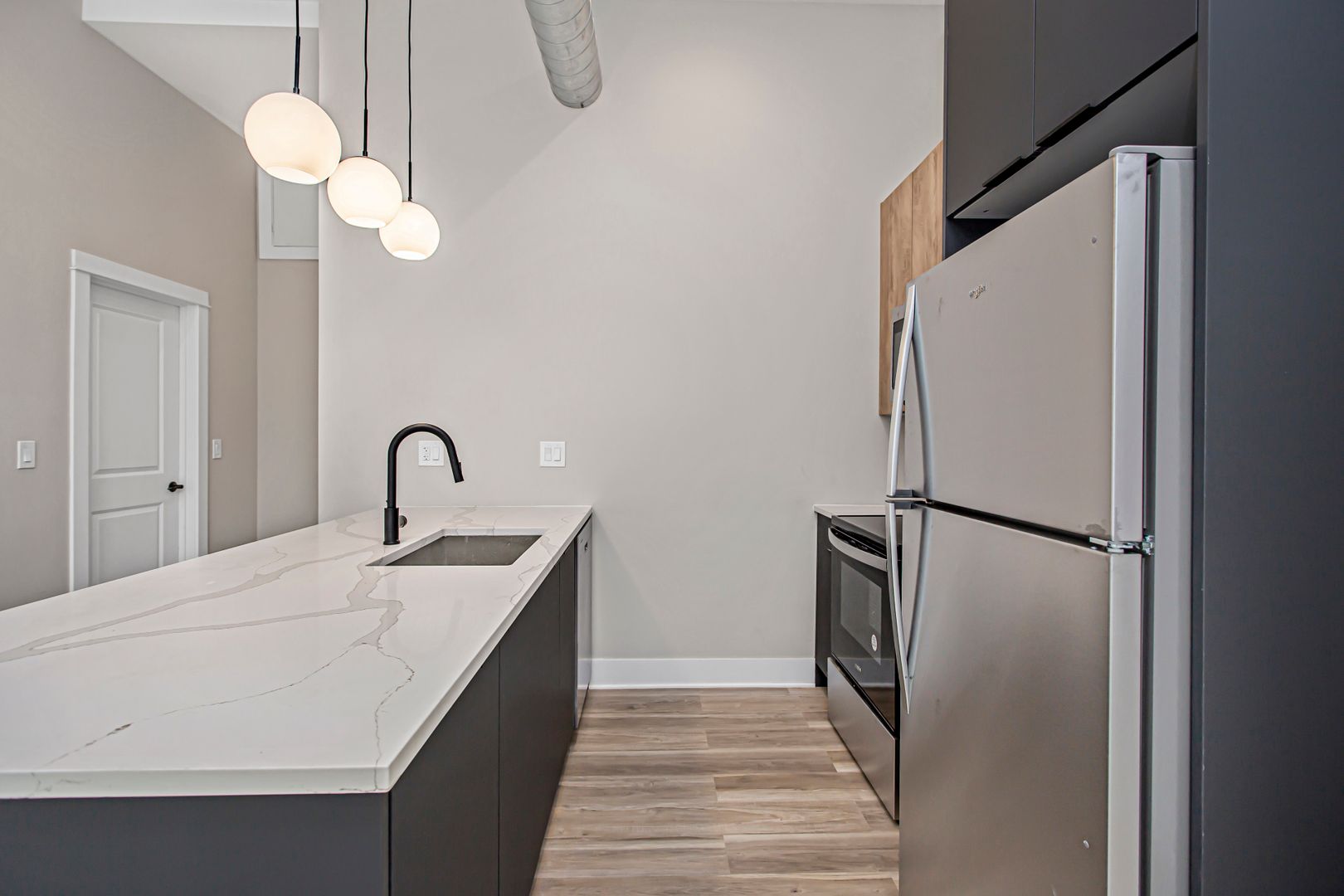 This unit features an open living concept with large breakfast bar, high ceilings, massive windows, and tons of natural light, beautifully complemented by the modern finishes. Other in-unit amenities include stainless steel electric appliances, modern flat-panel cabinetry with quartz countertops, front-loading washer & dryer, central heat & air, luxury vinyl plank flooring, roller shades, and more!