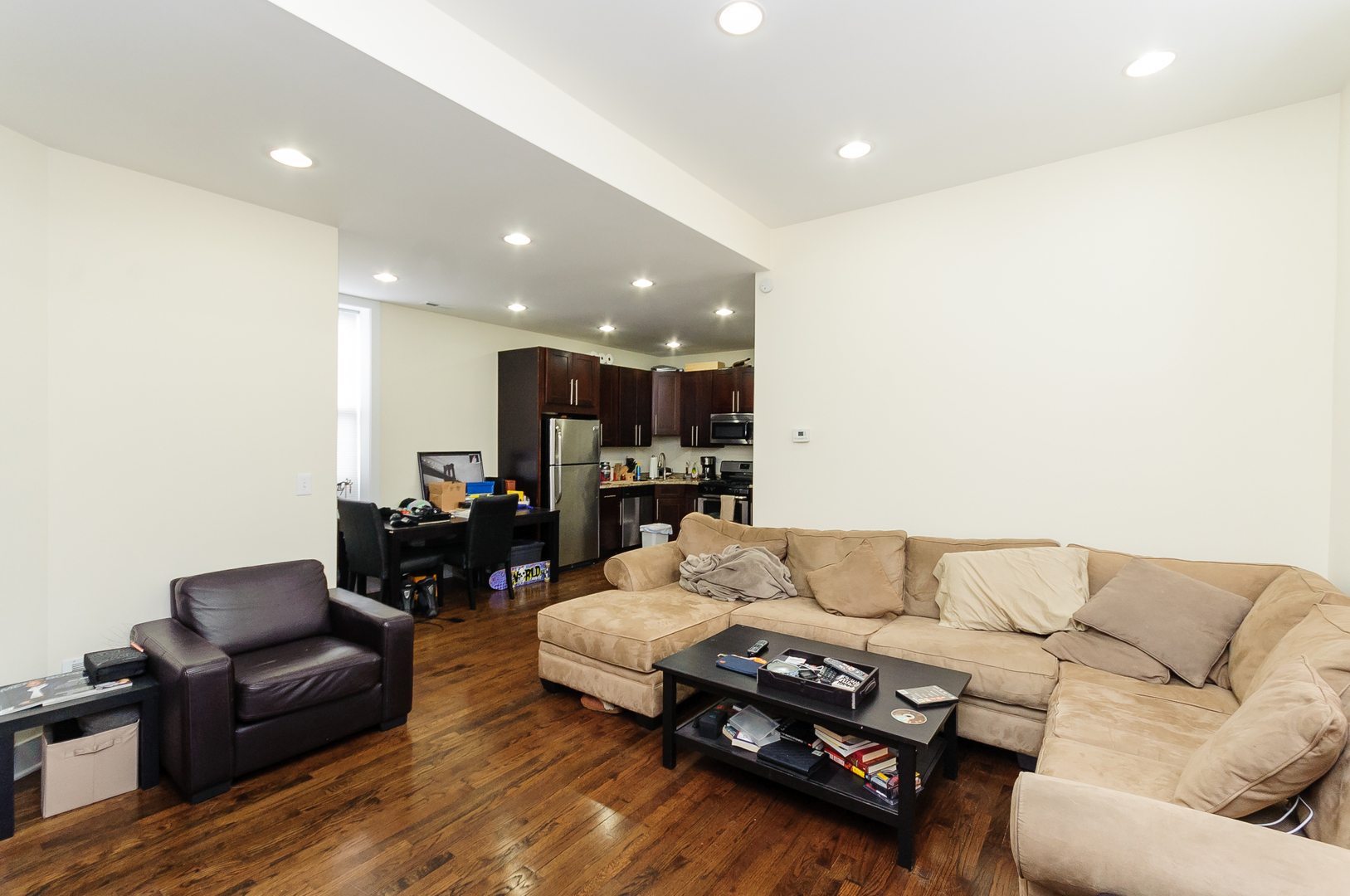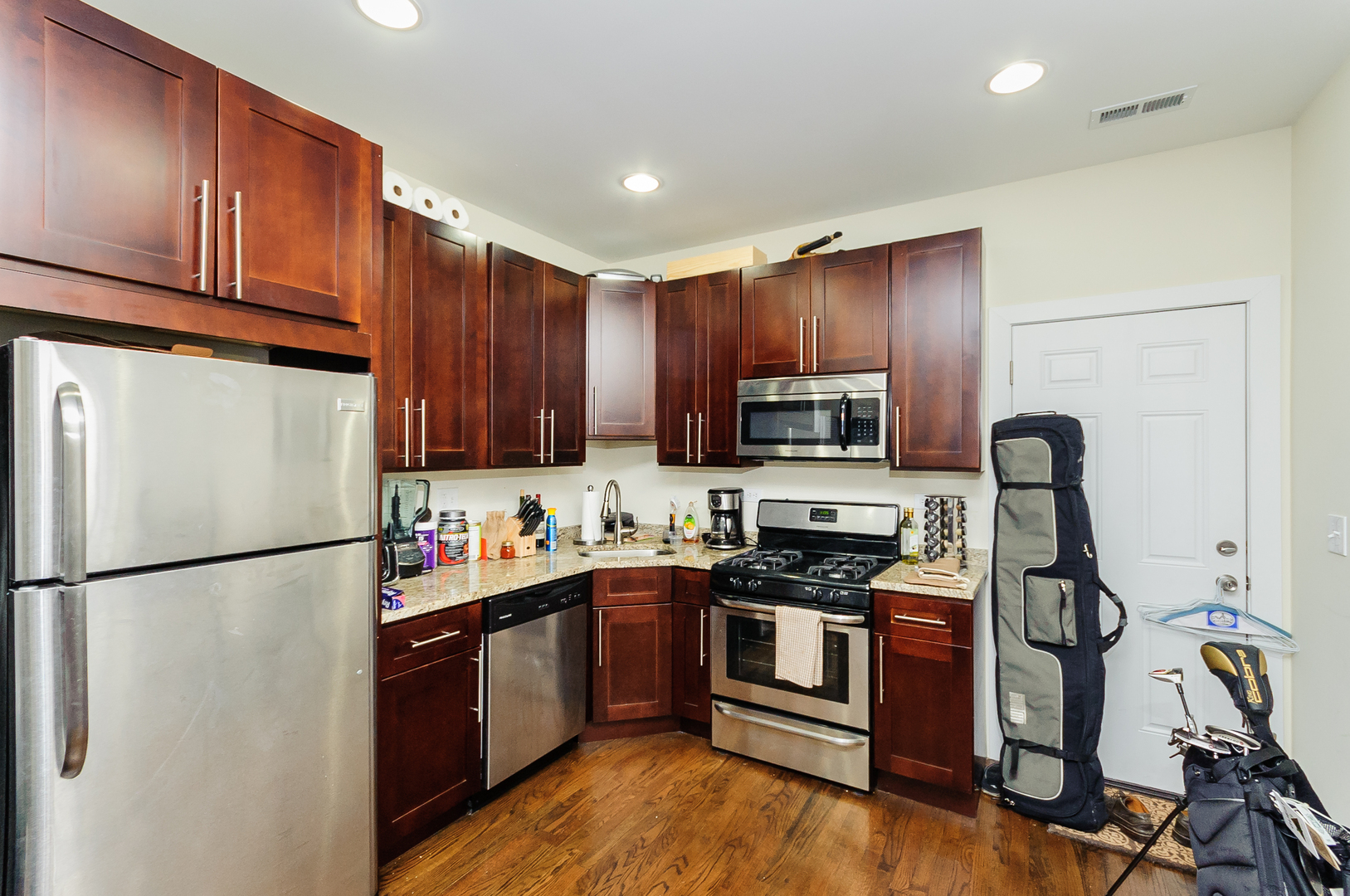 UNIT FEATURES: Open concept living room and kitchen! Stainless steel kitchen appliances, hardwood floors throughout, in-unit washer/dryer, central air conditioning and heat, newly remodeled kitchen with granite countertops, tile backsplash & custom cabinetry. Unit has back patio where you can grill!