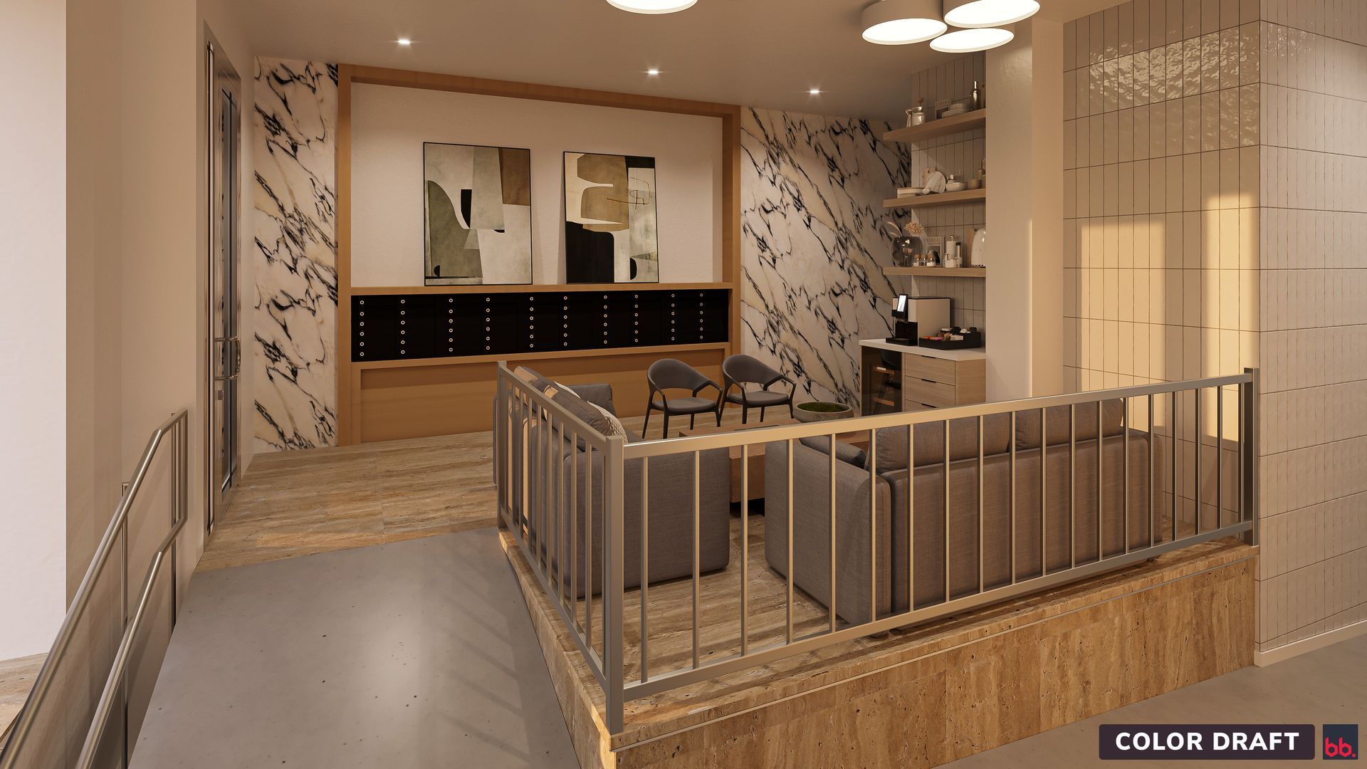 Need a place to relax before heading to work? Grab a coffee & take a seat in our mini lounge - located just inside the main entry door on Evergreen Ave! This mini lounge features a mail & package receiving area, a mini coffee bar, and seating to kick back.